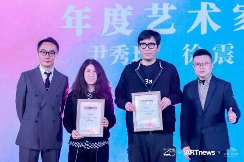 ARTnews中文版出版人郝宁(左一),泸州老窖国窖酒类销售股份有限公司上海片区经理邱帆(右一)为尹秀珍(左二)、徐震(右二)颁发“年度艺术家”奖